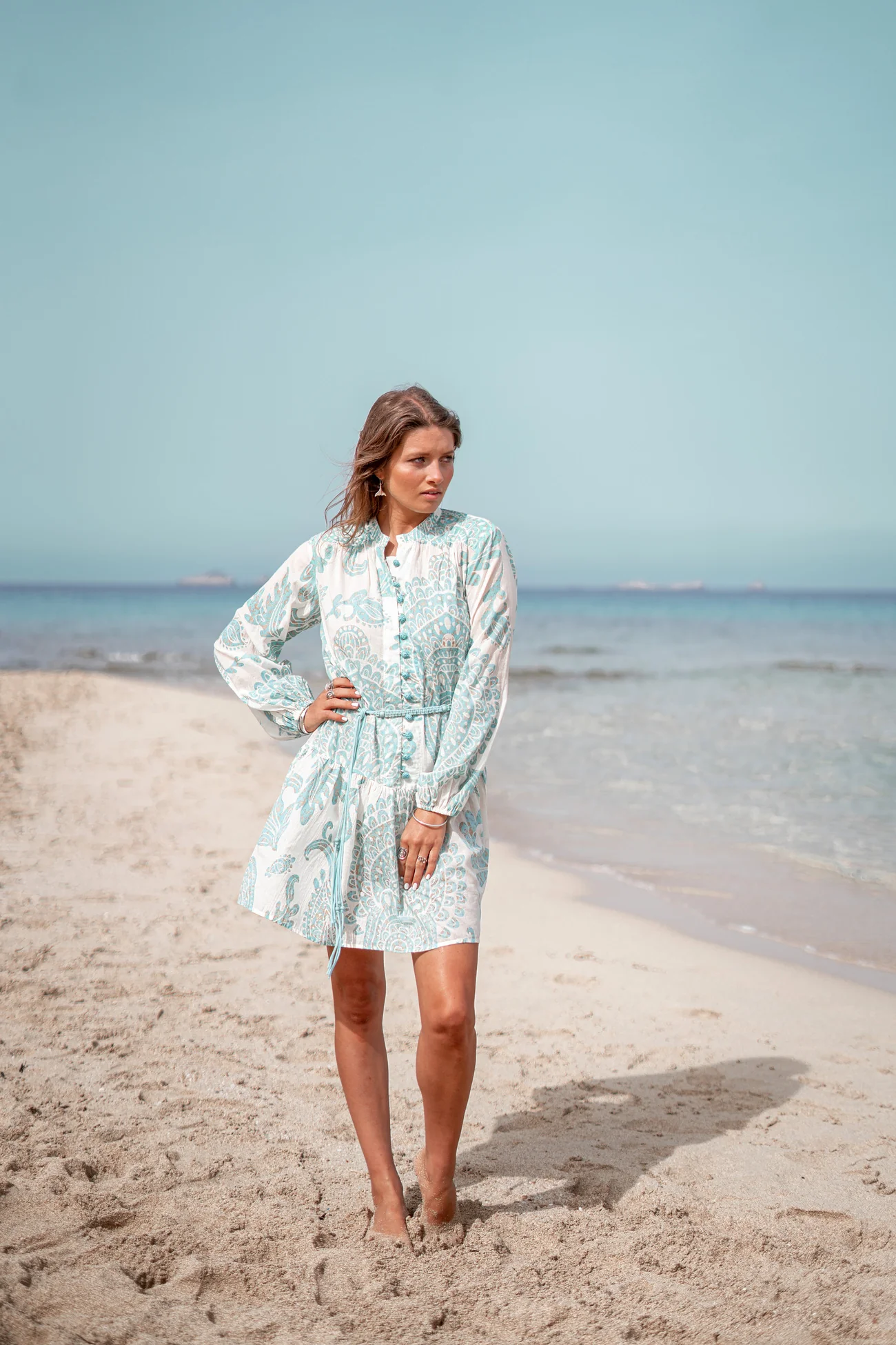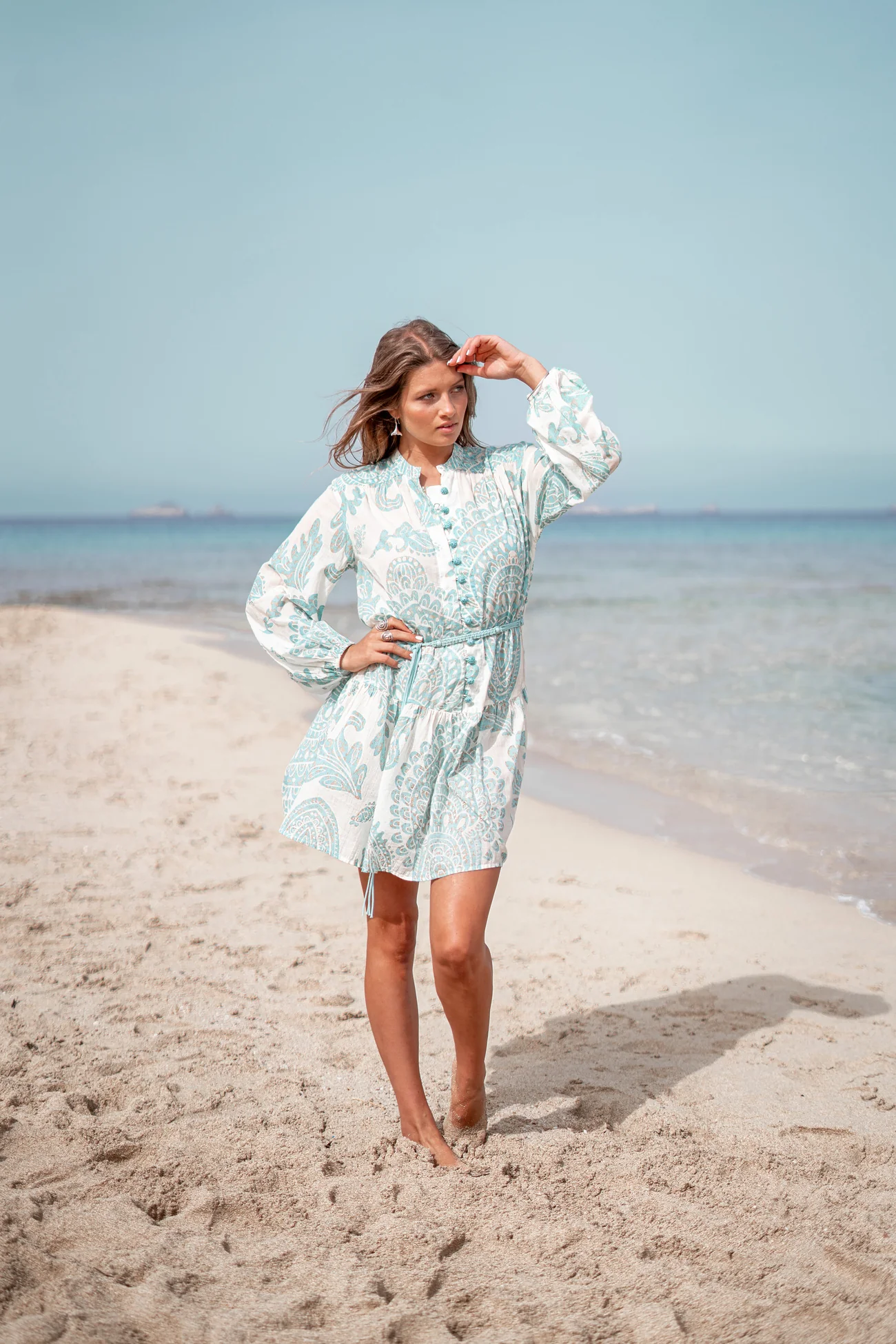 Deze Short Dress Adella Aqua van ibzmode in het aqua ademt Ibiza vibes. Heeft een V-hals, bezet met een mandala bloemen print, openstaand kraagje, sluit met een knoopsluiti Draag het met je favoriete accessoires voor een echte brands of Ibiza-look. Shop nu bij ibizamode en straal deze zomer in stijl.