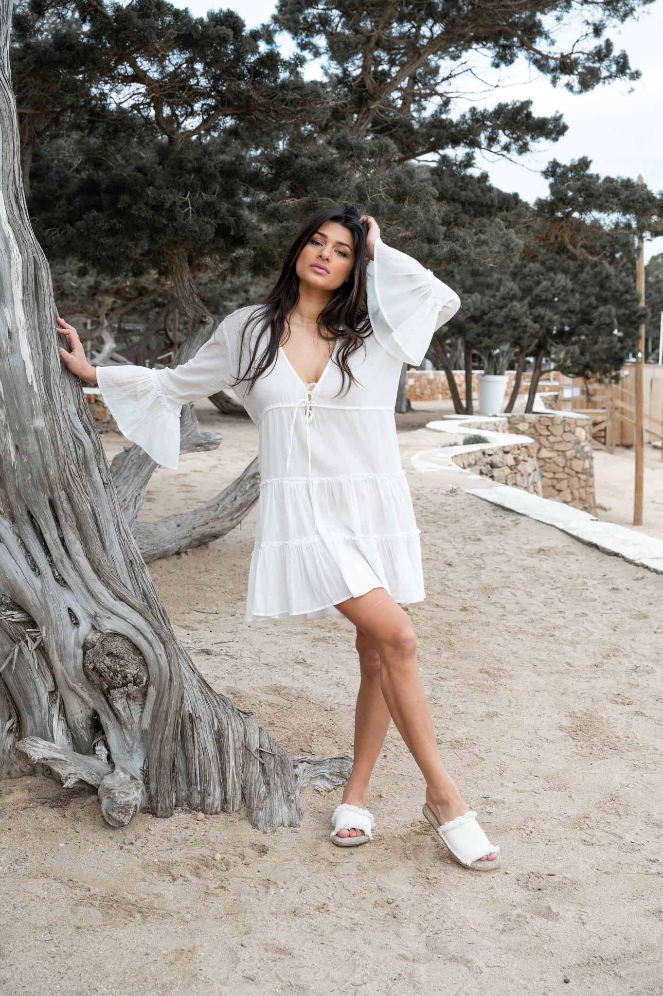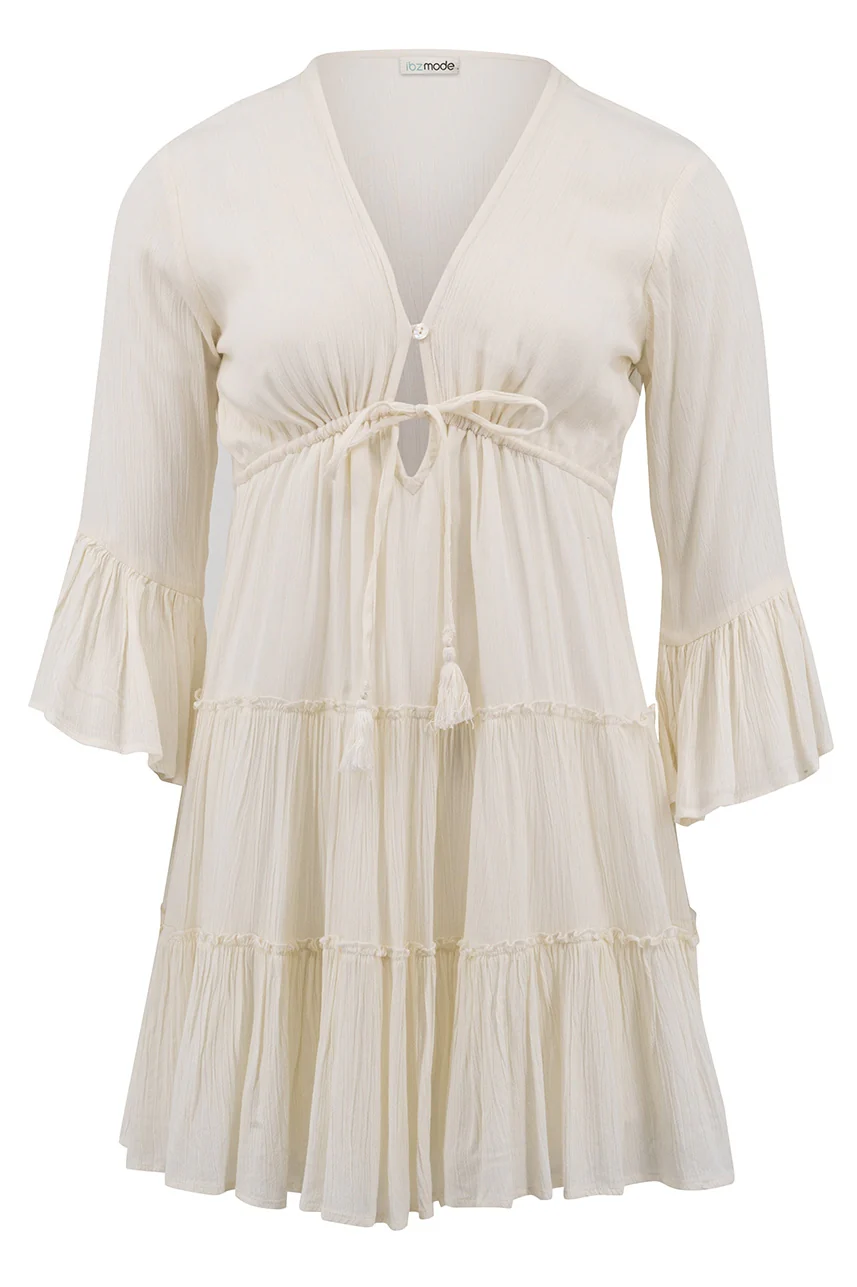 Op zoek naar een item met bohemian flair? Dan is de Short Dress Alise Ivory van ibzmode jouw match. Heeft een V-hals, sluit met een knoopsluiting bij de buste, heeft flair mouwen, heeft een onderjurkj Het natuurlijke materiaal zorgt voor een luchtige feel. Voeg deze must-have toe aan je zomergarderobe.