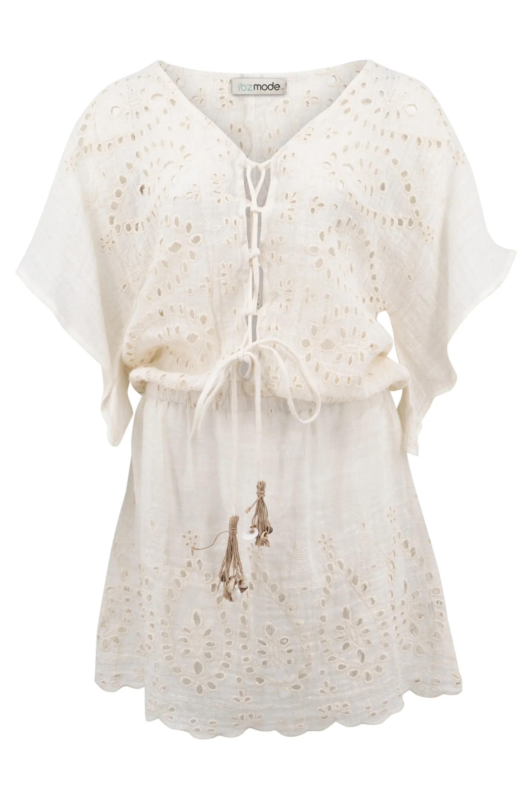 Op zoek naar een item met bohemian flair? Dan is de Short Dress Mirabel Ecru van ibzmode jouw match. Linnen broderie jurkje met elastische band in de taille, Bewerkt met schelpjes en jute. Draagt heerl Het natuurlijke materiaal zorgt voor een luchtige feel. Nu verkrijgbaar bij ibizamode – ontdek meer op Brands of Ibiza.