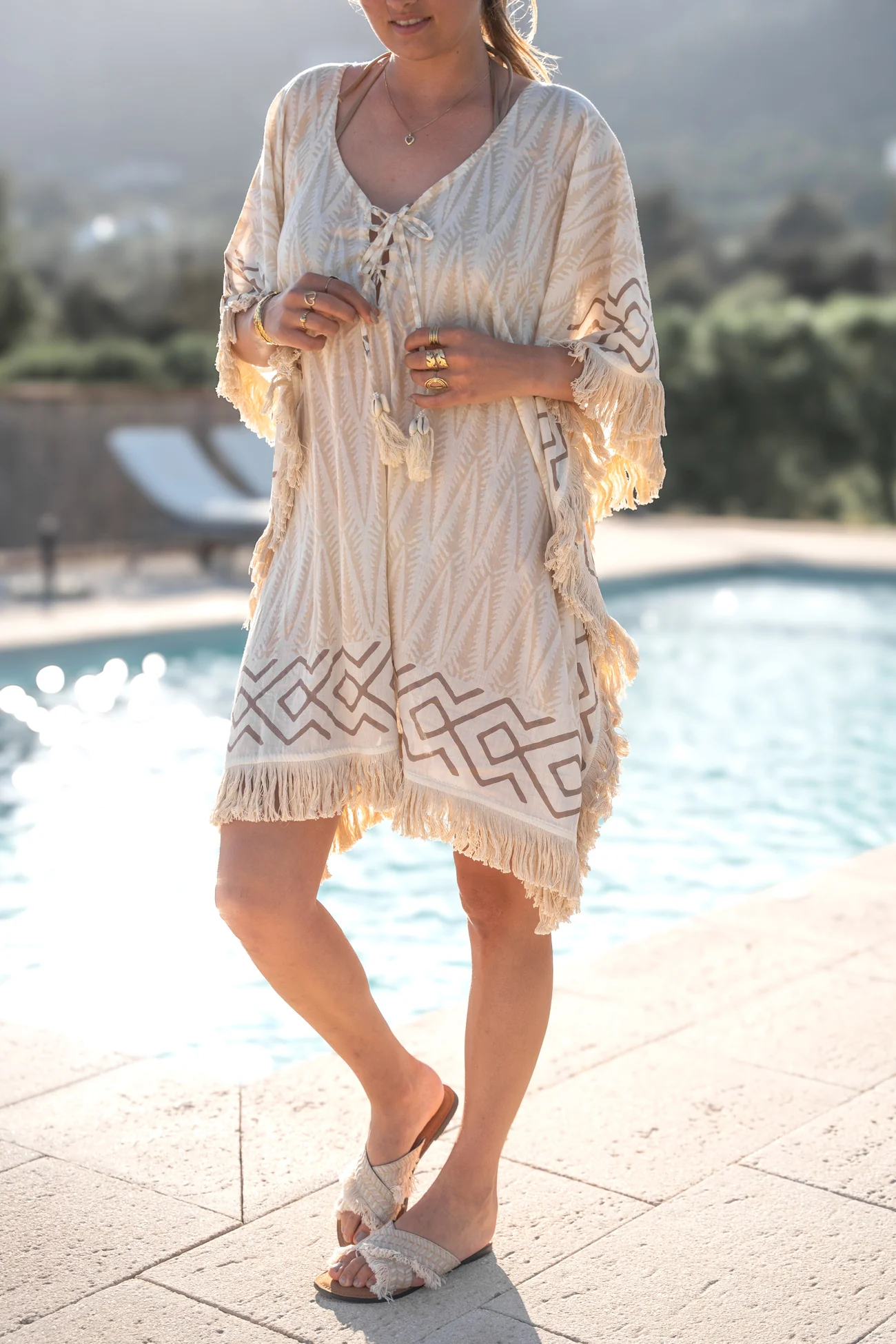 Deze Short Kaftan Impresion Tree van ibzmode in het multi ademt Ibiza vibes. Heeft een geveterde V-hals met touwtjes met kwastjes en schelpjes, zomerse print, bezet met franjeba De luchtige stof voelt zacht aan op je huid. Voeg deze must-have toe aan je zomergarderobe.