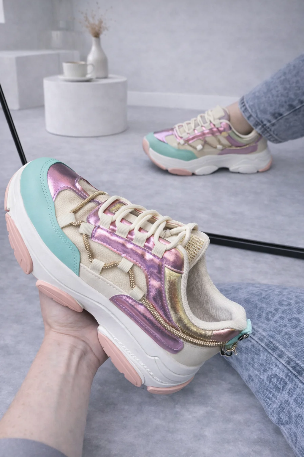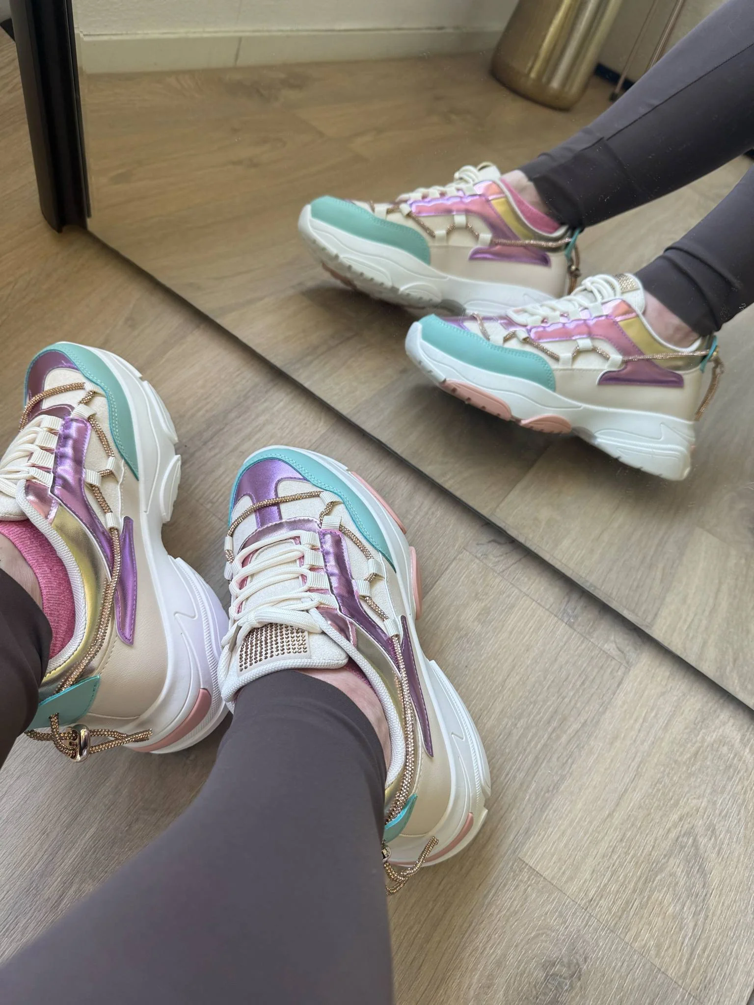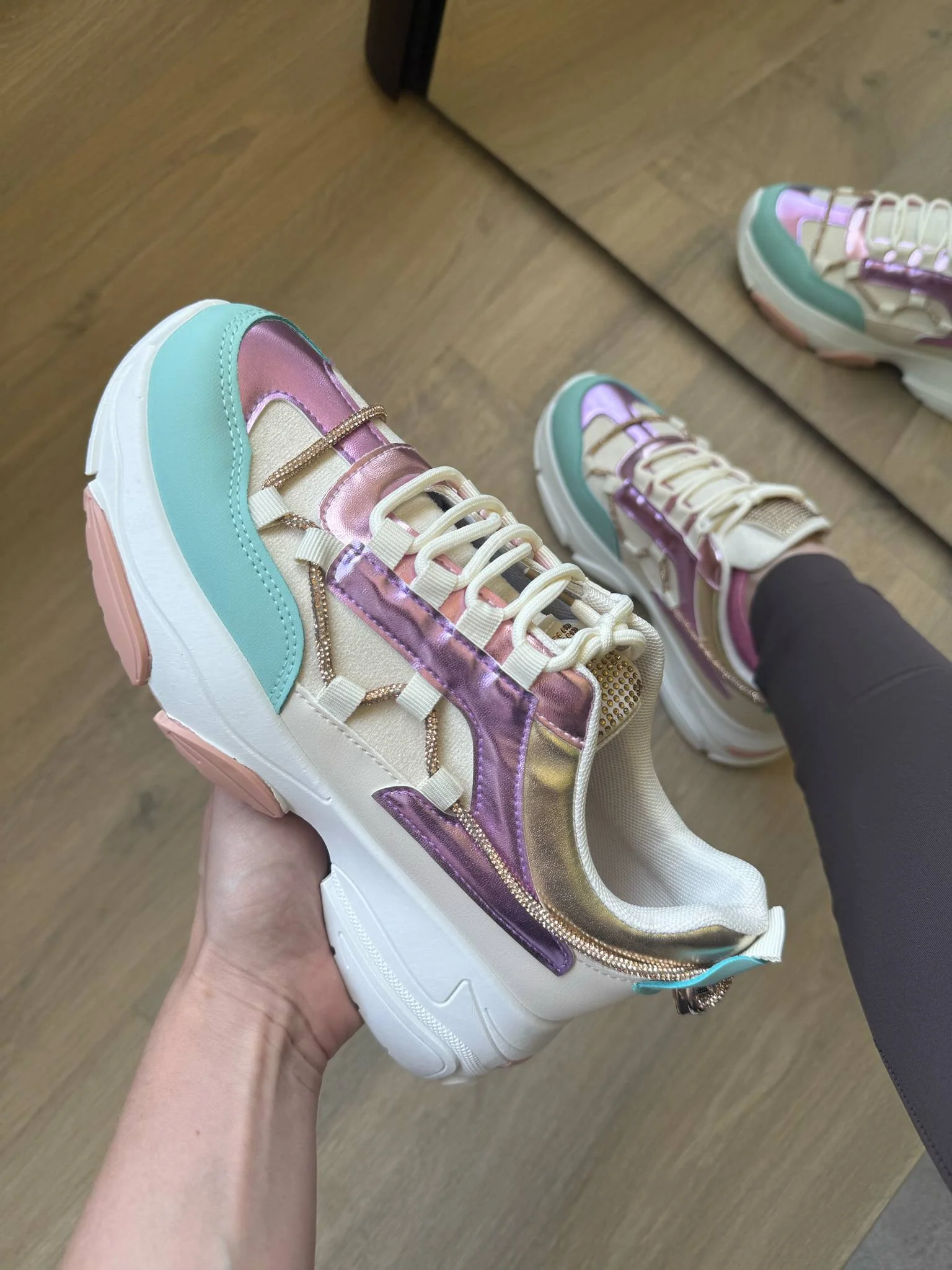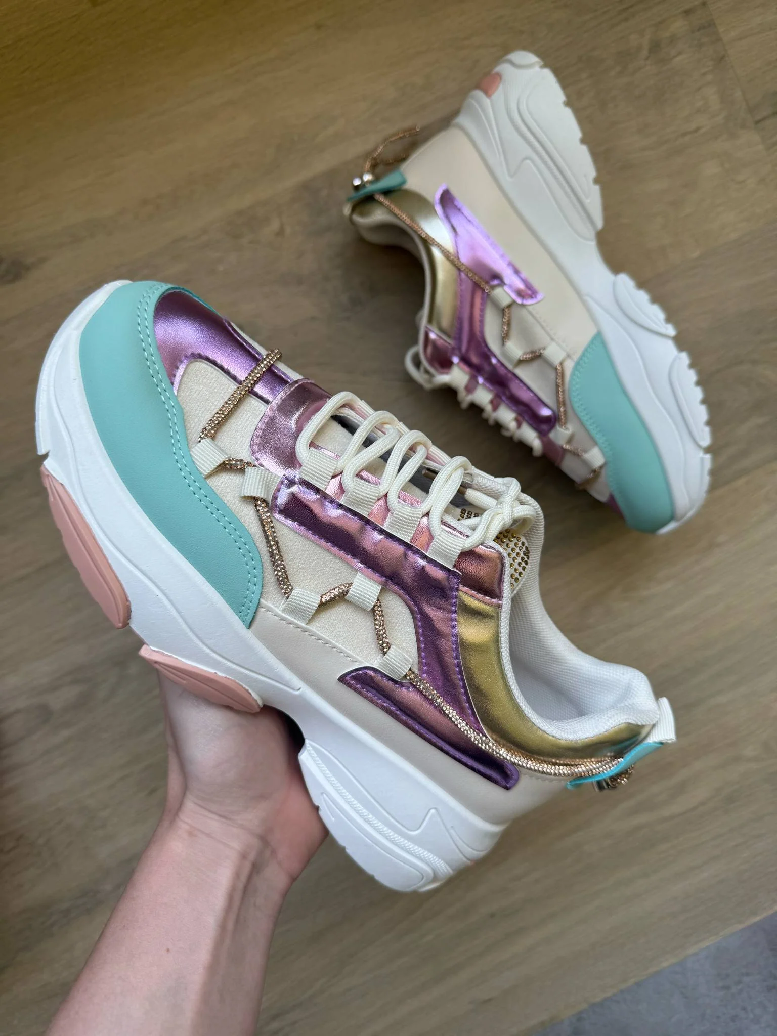 | Kleur: Lila, lichtblauw, wit, goud, beige en lichtroze details op de zool. |
