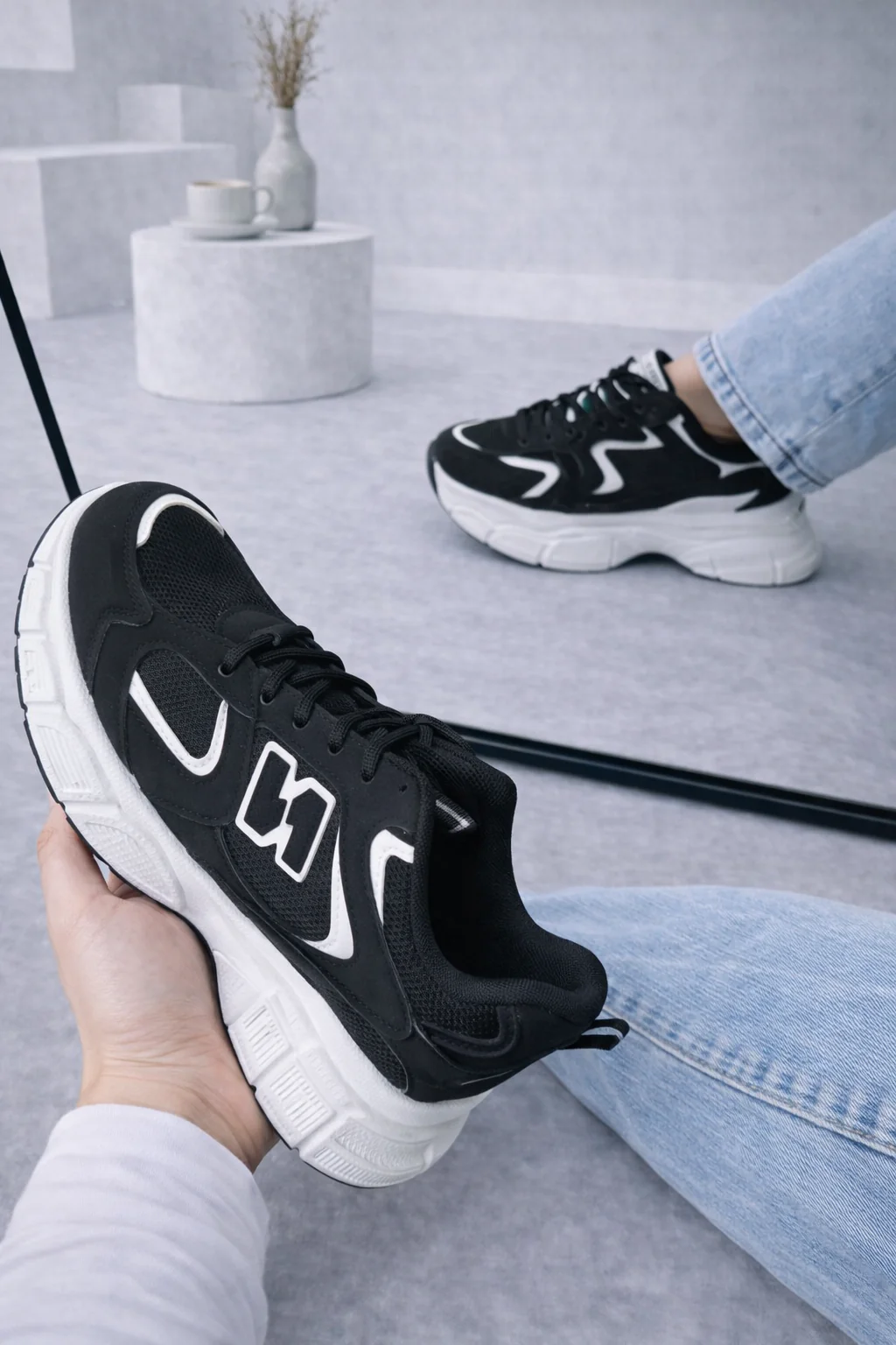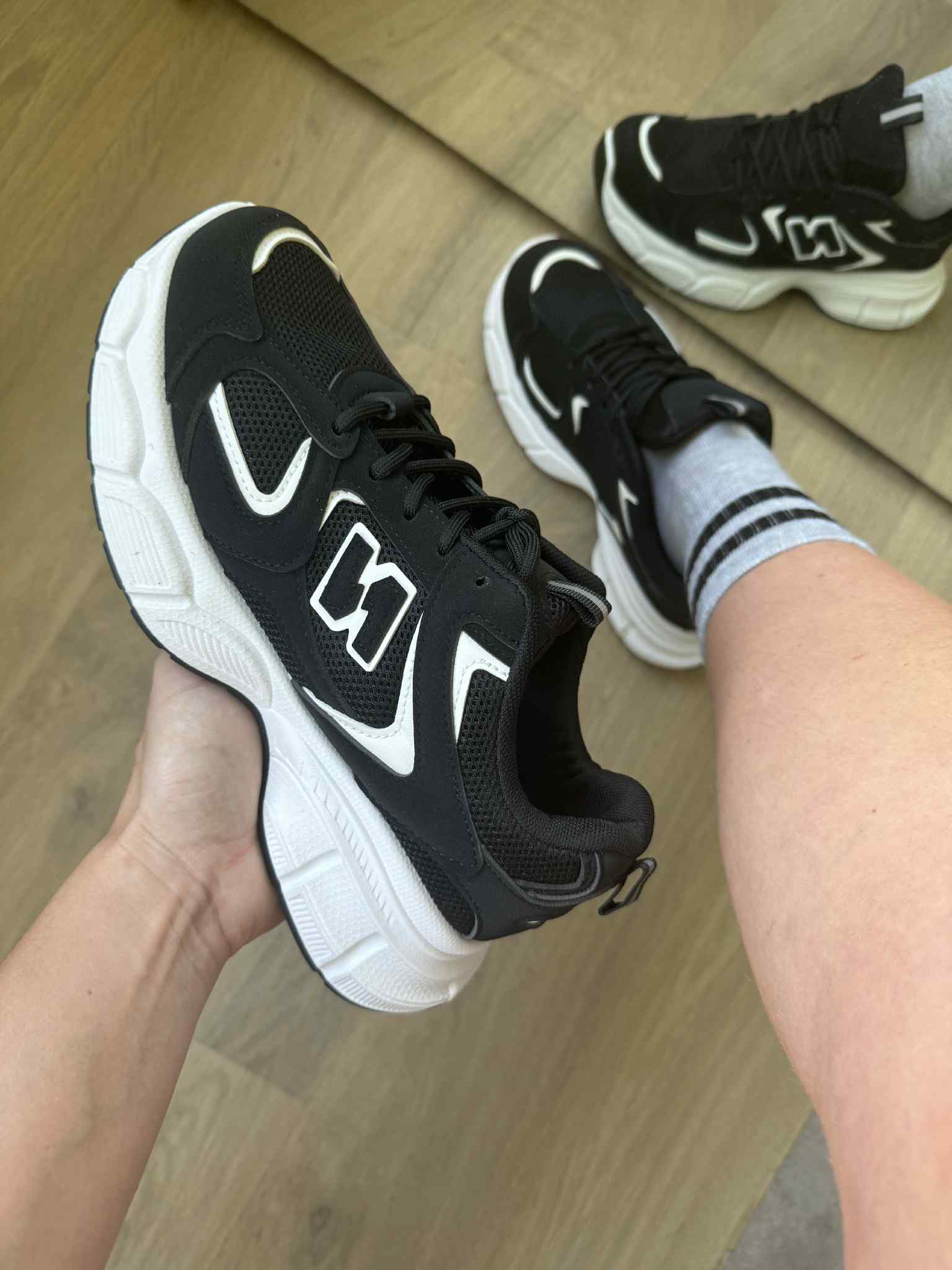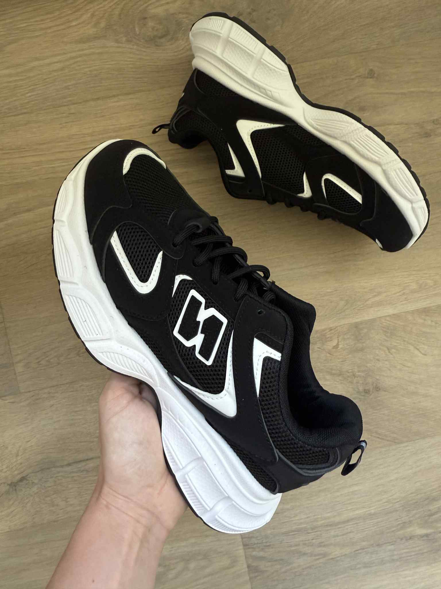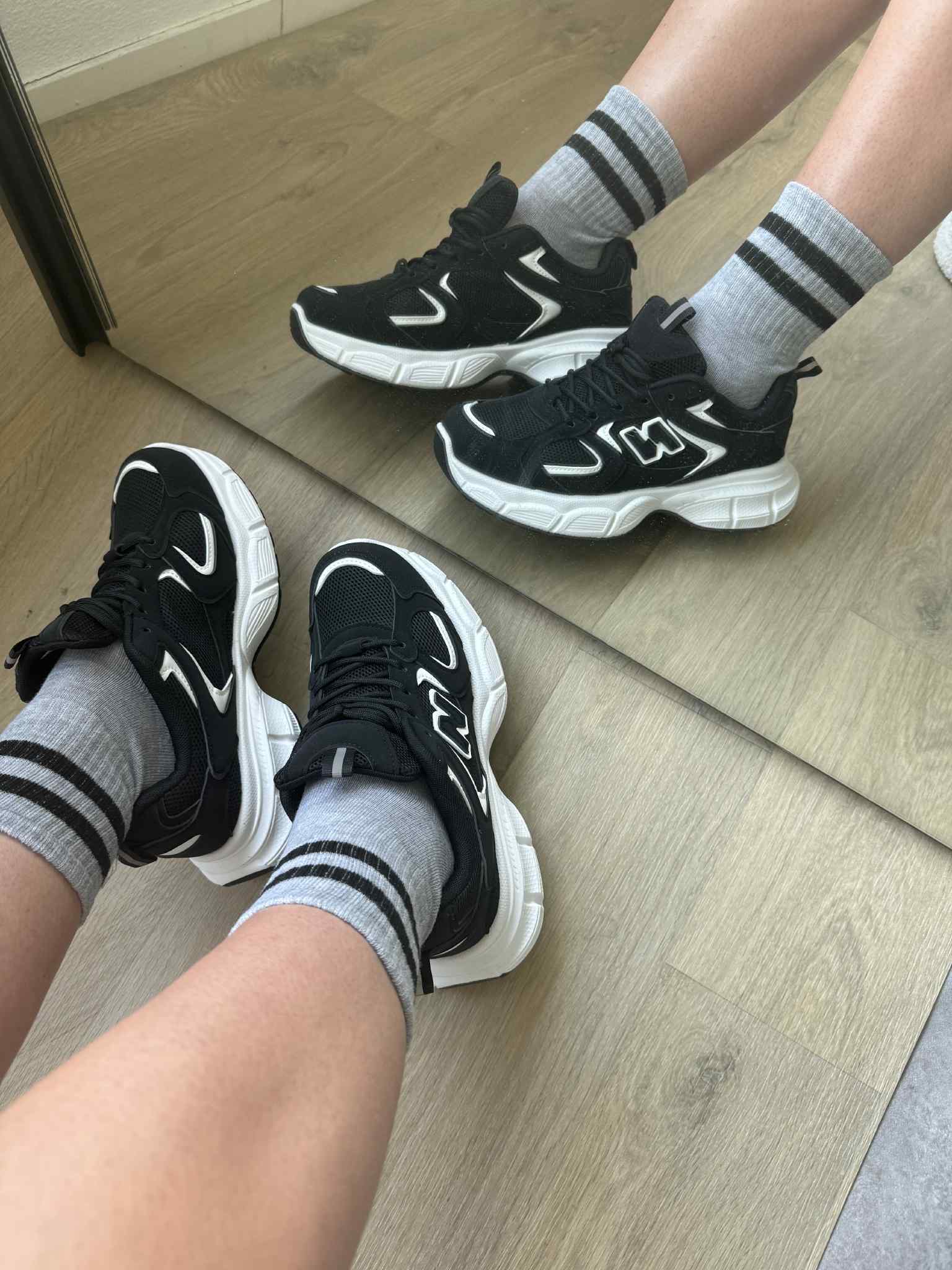| Kleur: Zwart met witte zool en logo. |
