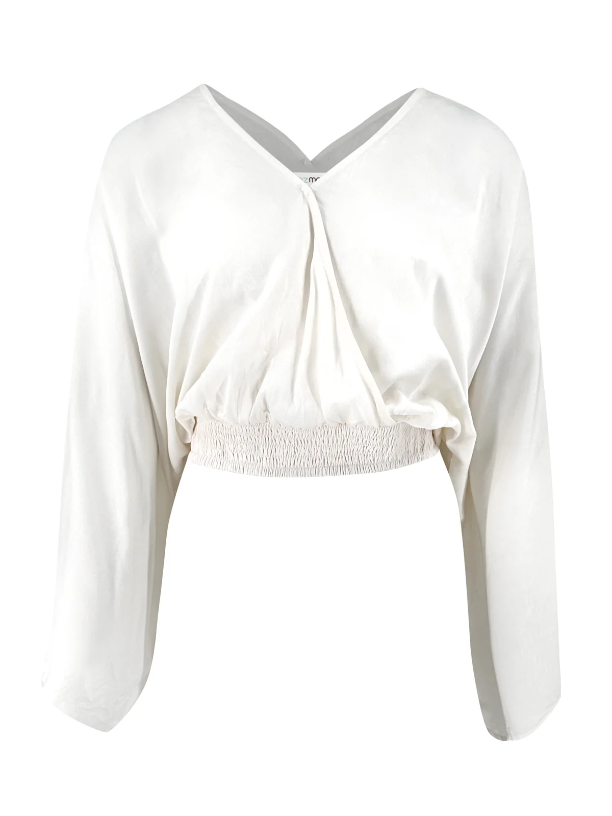 Geef jouw garderobe een update met de Top Jazmin Luz Ivory, ontworpen voor zonnige dagen. Korte top met elastieken band in de taille, wijd uitlopende mouwen, de overslag sluit met een drukkn Perfect te combineren met slippers, een basic top of een lichte blouse. Shop nu bij ibizamode en straal deze zomer in stijl.