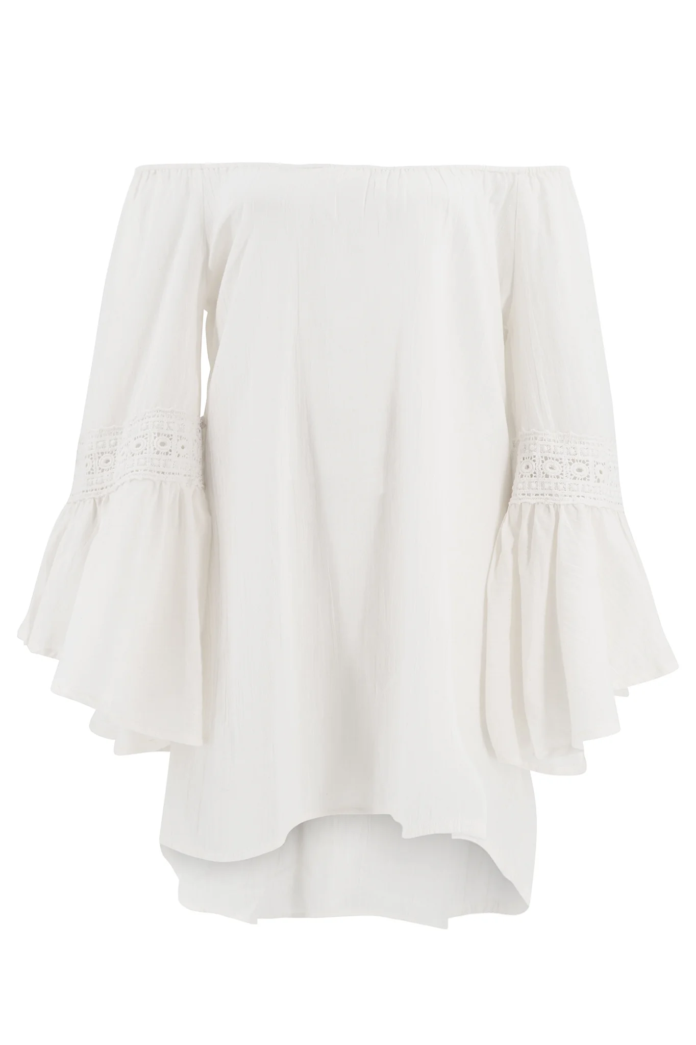 Deze Tunic Maisa Ivory van ibzmode in het ivory ademt Ibiza vibes. Heeft een off shoulder model, elastische band in de hals, bewerkt met crochet details Het natuurlijke materiaal zorgt voor een luchtige feel. Nu verkrijgbaar bij ibizamode – ontdek meer op Brands of Ibiza.