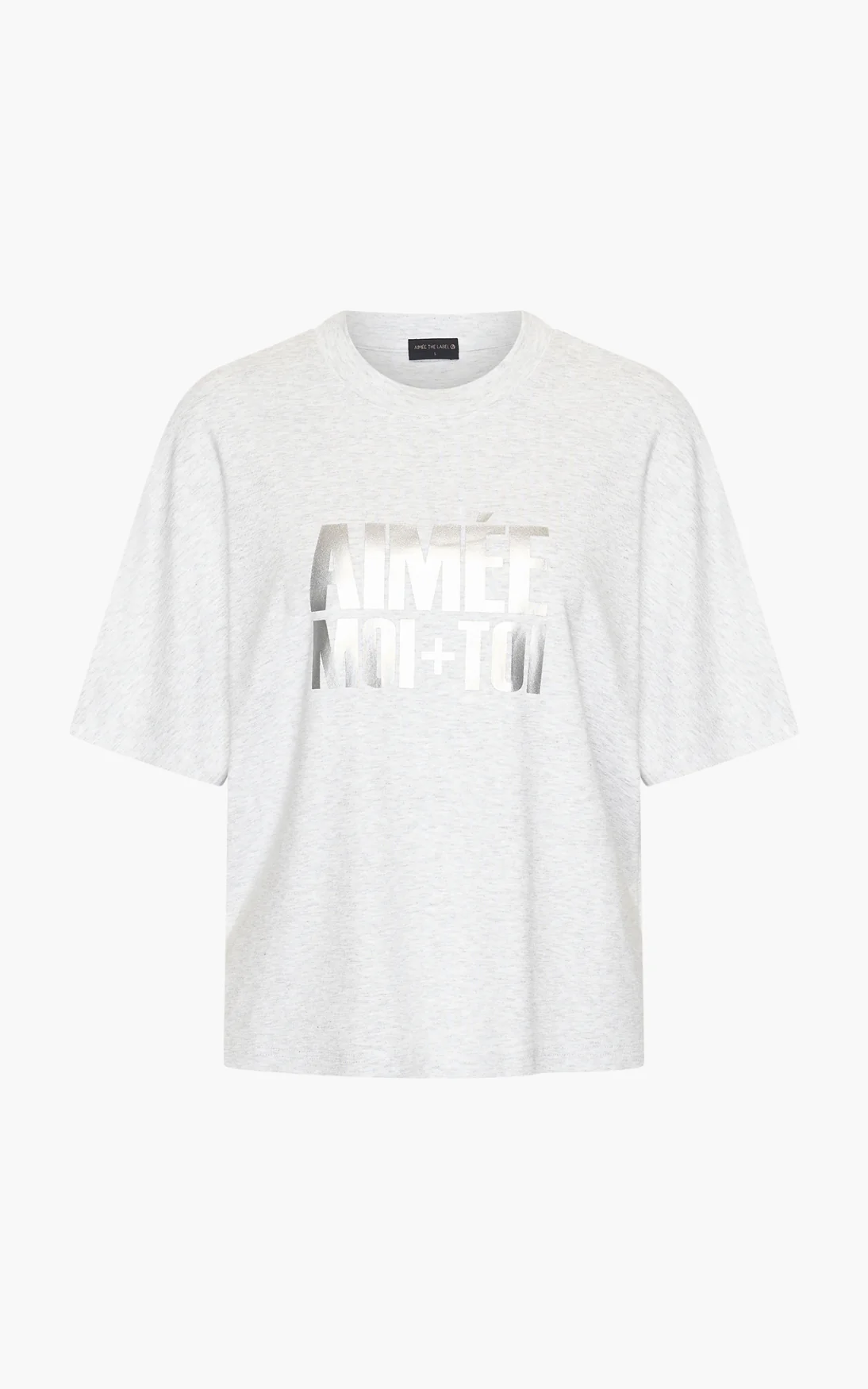 De Willeke tee is een t-shirt dat basic comfort combineert met een speels accent. Uitgevoerd in grijs mêlee, met zilverkleurige glimmende letters “Aimée toi+moi” op de voorkant.
